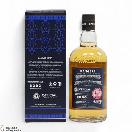 Rangers 150th Anniversary Blended Malt Scotch Whisky. This Limited Edition small batch Blended Malt Scotch Whisky commemorates 150 years of Rangers Football Club. Matured in Oak casks selected by Rangers Football Club. This is one of only 3000 bottles.