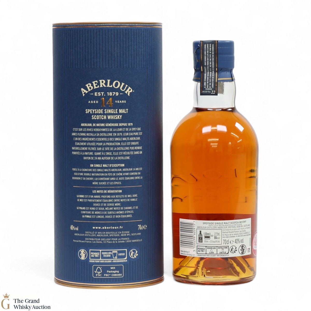 This Aberlour 14 Year Old, has been double cask matured in two handmade oak cask types. The double maturation of both American oak and sherry casks adds depth of character to this single malt, now bottled at 40% abv.
