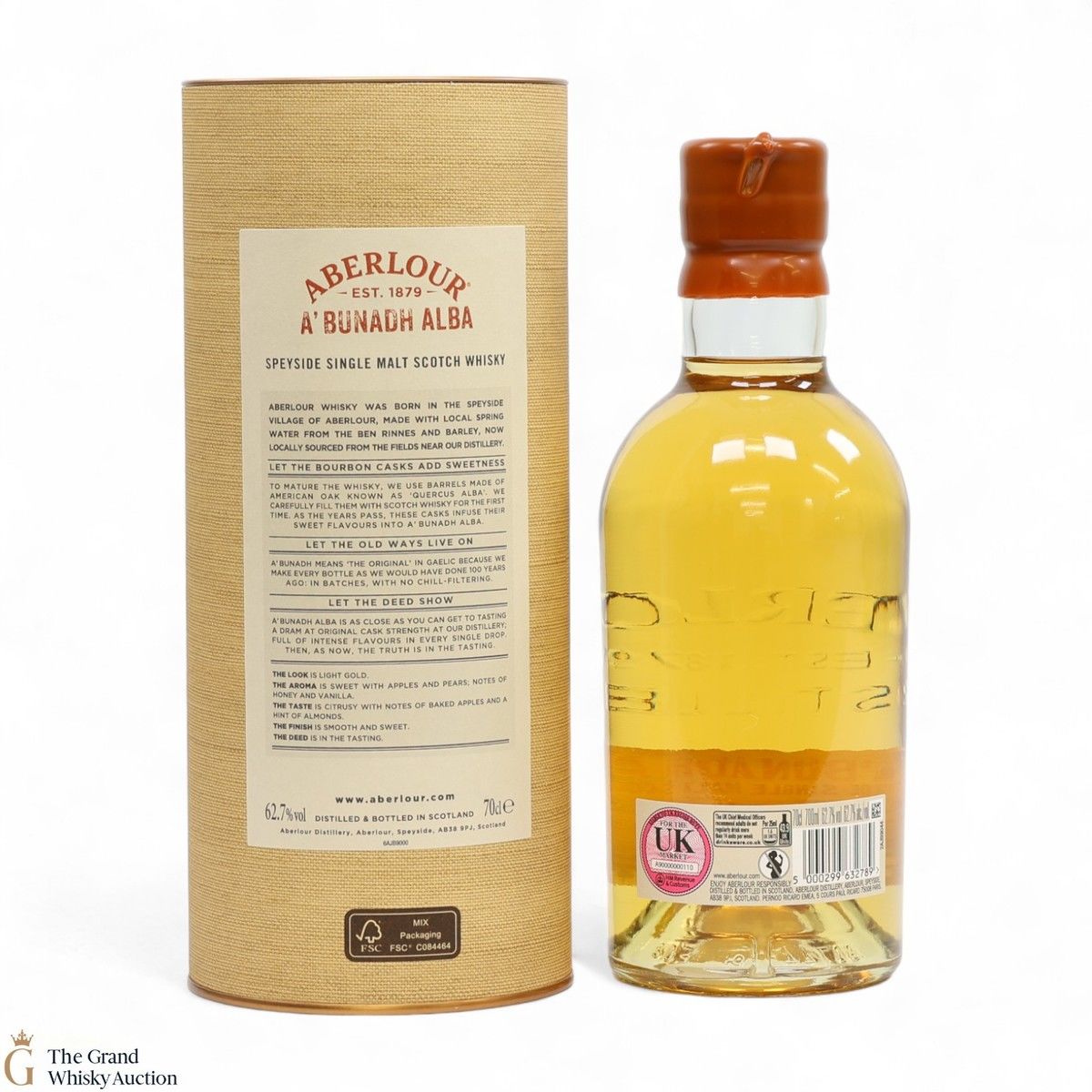 Distilled at the Aberlour Distillery, this single malt was matured in bourbon oak barrels until being bottled at the cask strength of 62.7% ABV. This is batch 5 of the A'Bunadh Alba.