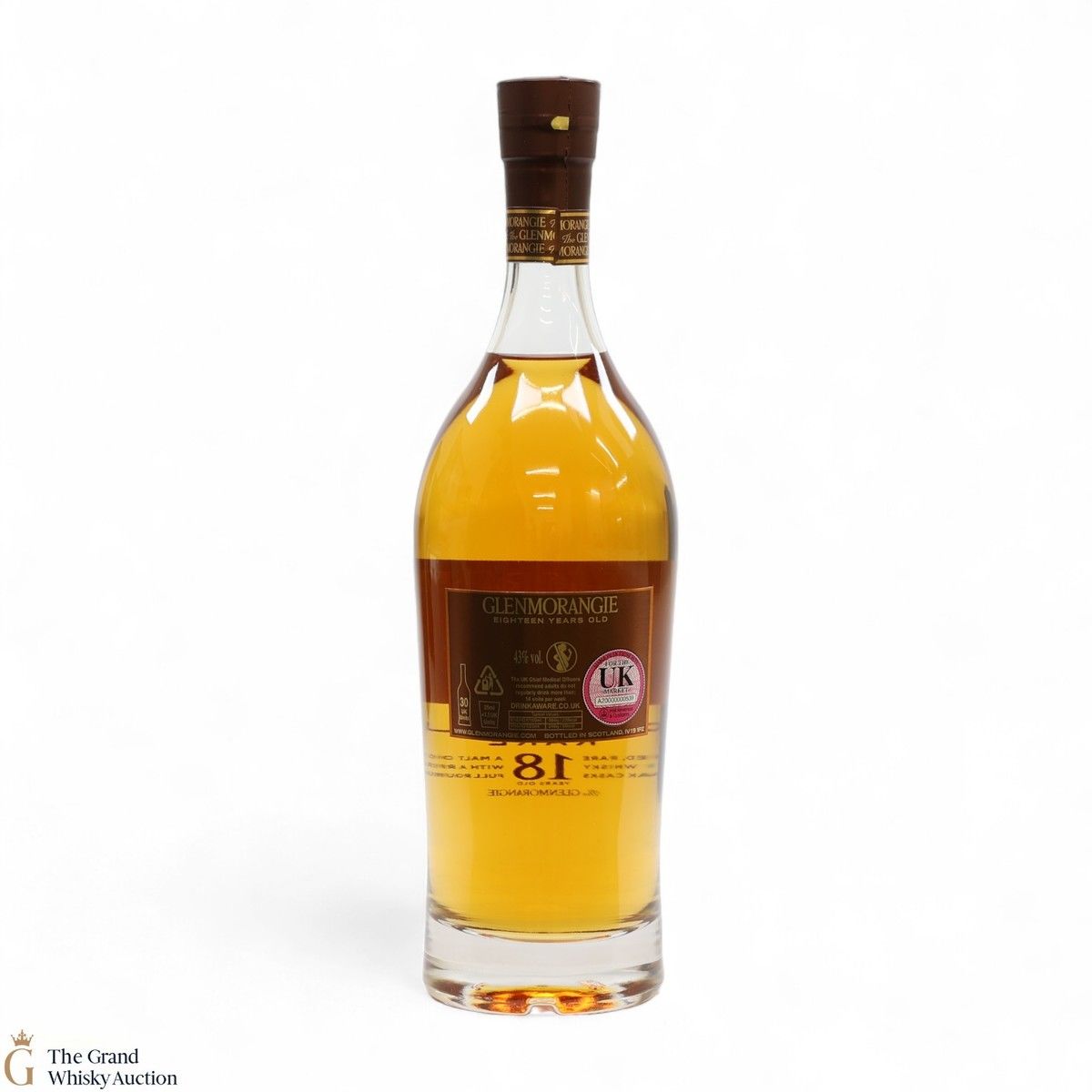 This bottle is an 18-year-old Extremely Rare, Highland single malt produced by Glenmorangie. It has been perfected by the sixteen men of Tain who have specially aged this bottle for 18 years in superior oak casks.
