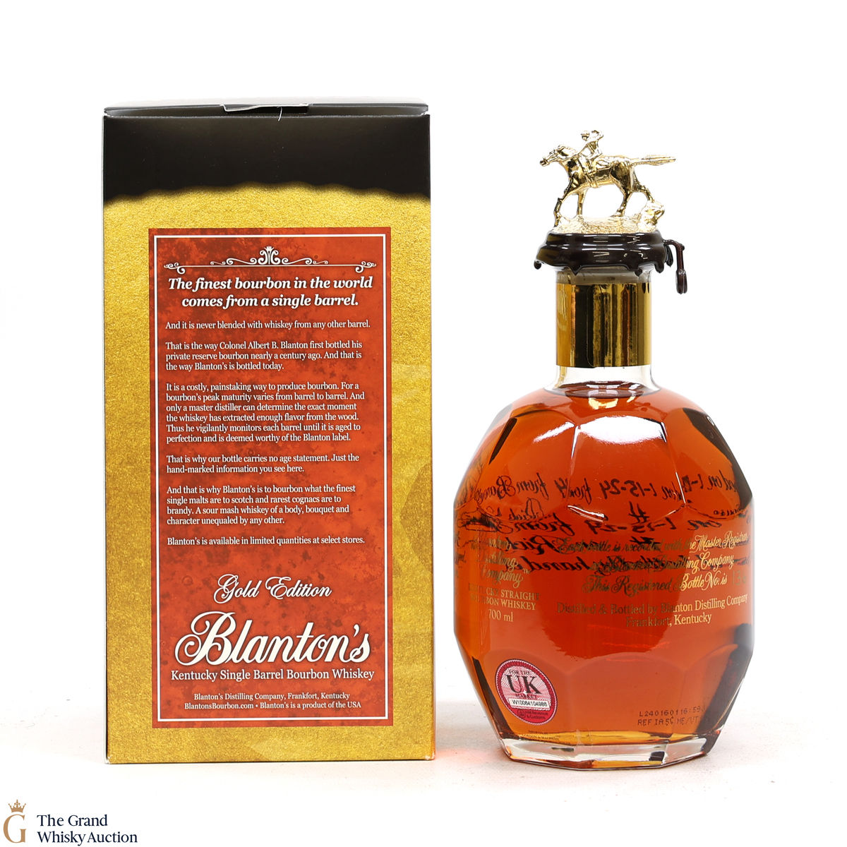 PLEASE NOTE: The wax seal on Blanton's bottles are prone to cracking in transit due to their design. Therefore, as stated in our T&C’s, we do not and will not accept liability should the seal be breached, broken, split or leak in transit. Additionally, please know due to the design of the internal cardboard packaging that surrounds the top of the bottles, it too may be torn. By bidding on this lot you have understood this to be true. Insurance is for complete breakage or loss in transit only.