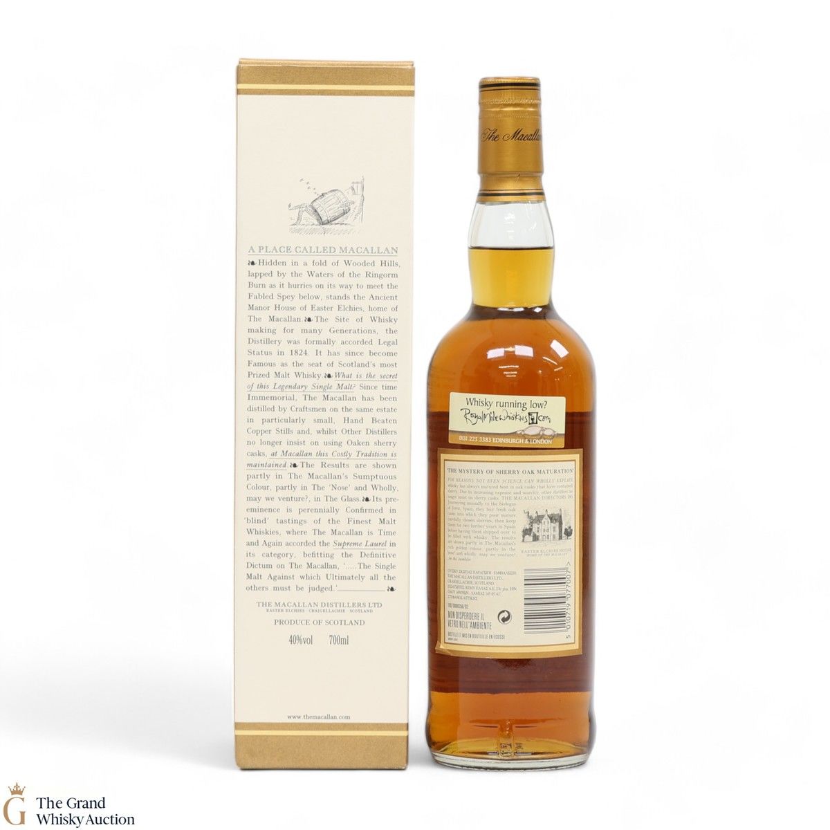 Due to the various ages of bottles and their seals, the condition of liquid is at the buyer's discretion and no claim can be lodged against failure/leakage in transit. Loss and breakage cover is available at 3% of the hammer price as standard. If the lot is not insured, no claim can be lodged against the courier or The Grand Whisky Auction for breakage or loss in transit.