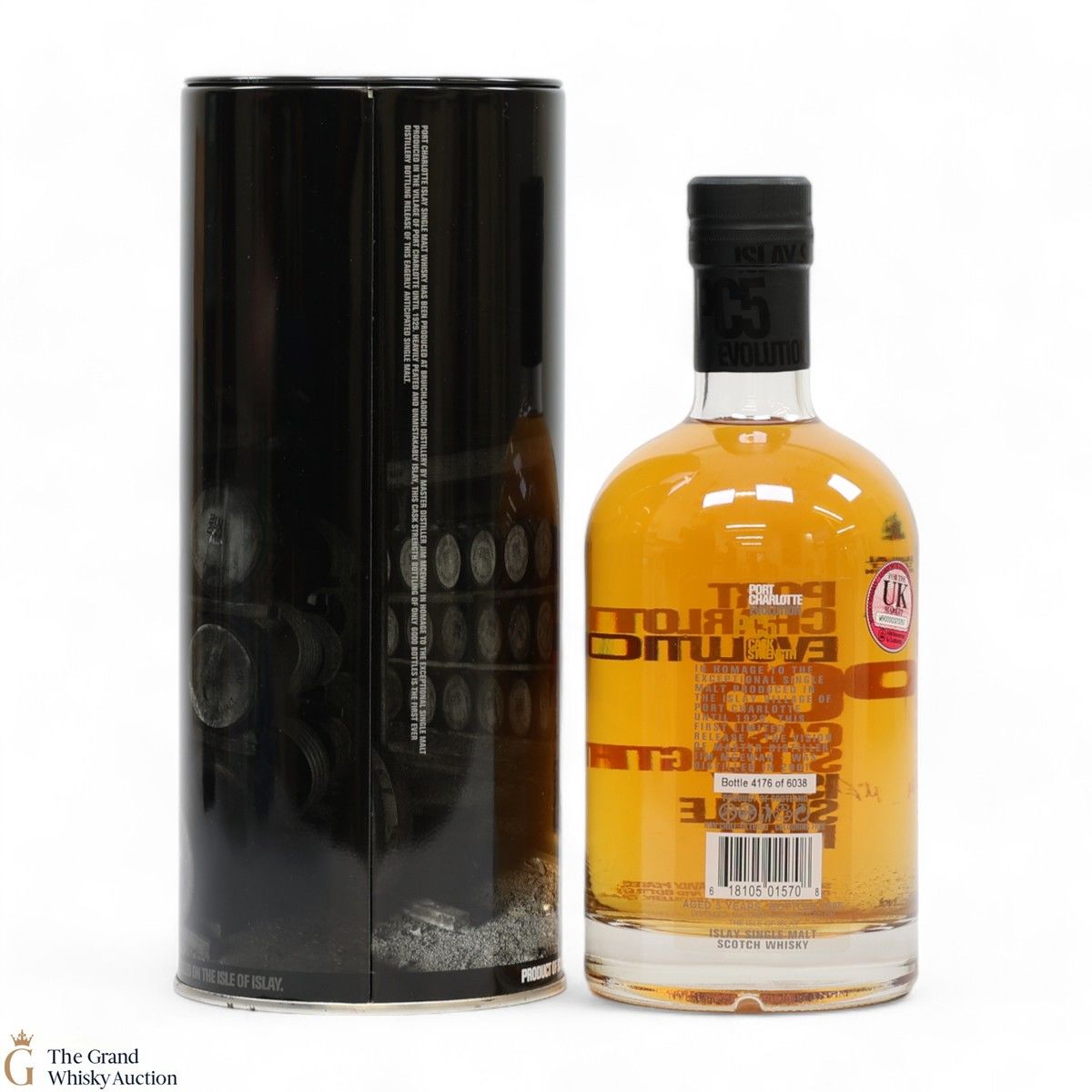 Port Charlotte PC5, produced by Bruichladdich Distillery, is a heavily peated spirit. It was the first release of heavily peated Port Charlotte and was produced in 2001 from some of the first spirits to be produced after the distillery's reopening. The single malt was bottled at 5 years old in 2006 and was limited to 6038 bottles.
