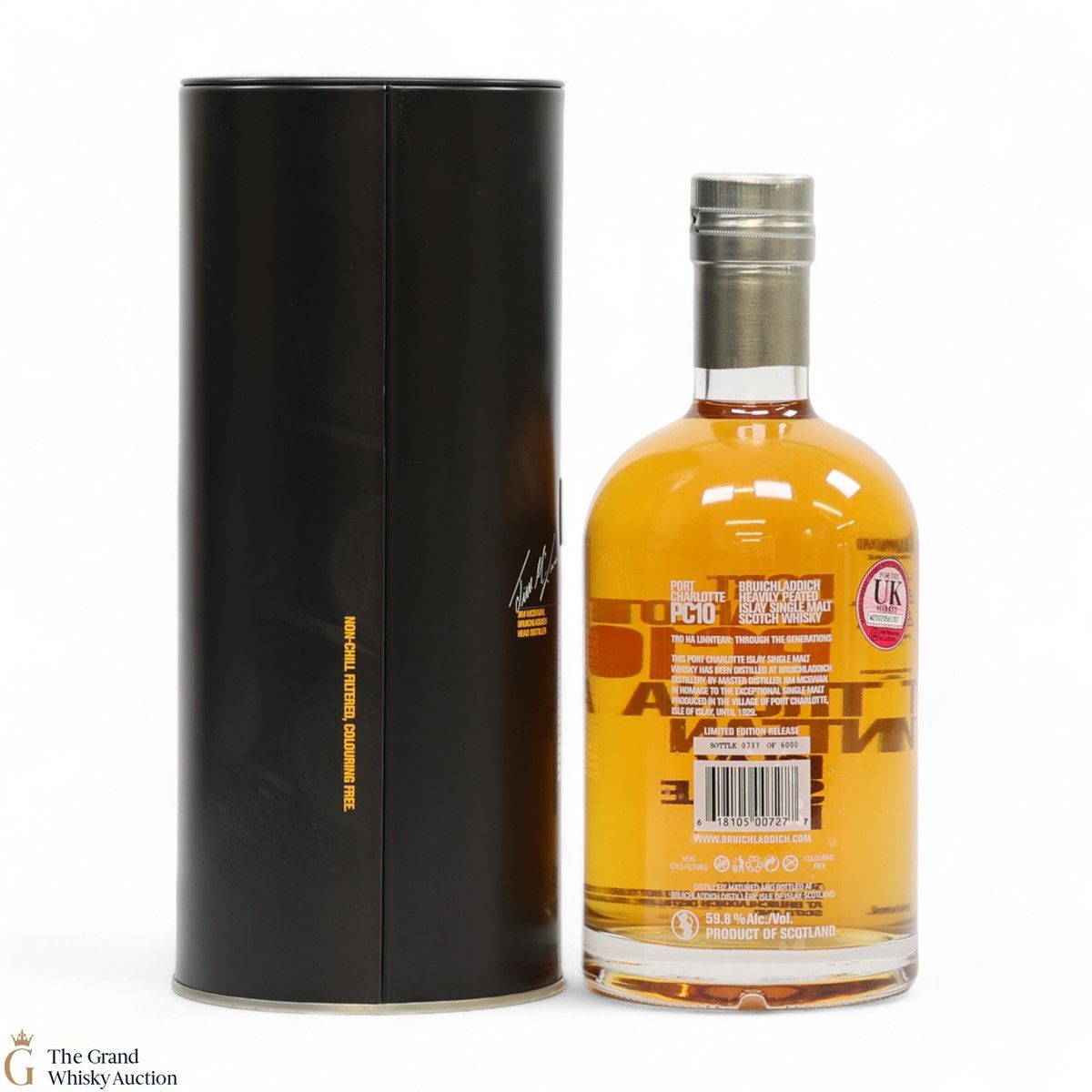 Port Charlotte PC10, produced by Bruichladdich Distillery, is a heavily peated spirit. It was the first release of heavily peated Port Charlotte and was produced in 2001 from some of the first spirits to be produced after the distillery's reopening. The single malt was bottled at 10 years old and was limited to 6000 bottles.