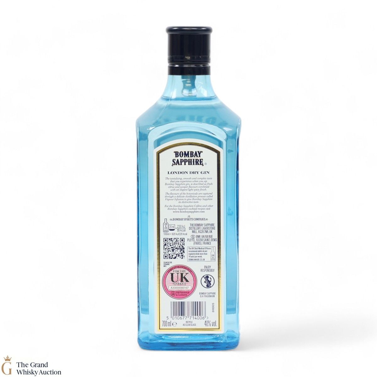 Bombay Sapphire London Dry Gin in its distinctive blue bottle. Every drop contains 10 hand-selected botanicals from exotic locations around the world.