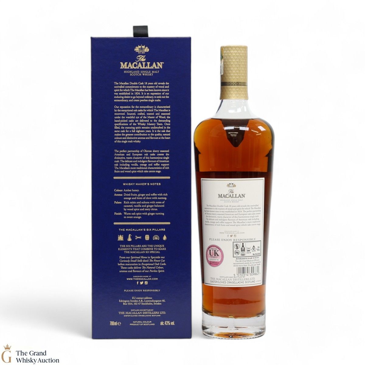 This 18-year-old Macallan was matured in a combination of American and European Sherry oak for a minimum of 18 years. It is part of the Macallan Double Cask range, which marries the classic Macallan style and the sweetness of American oak.