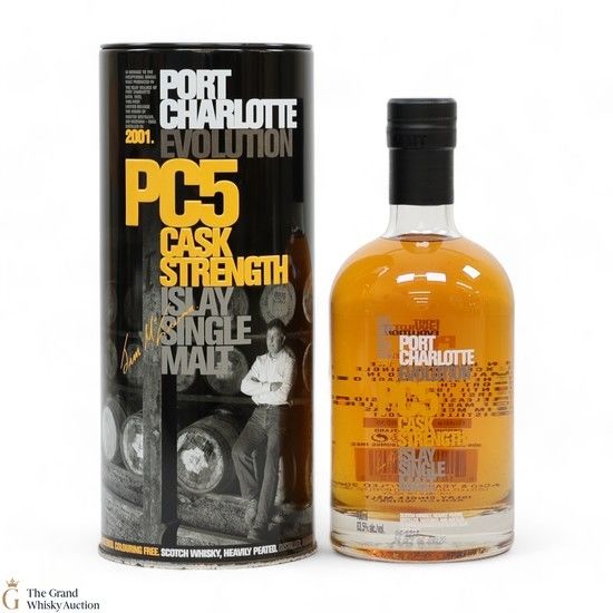 Port Charlotte PC5, produced by Bruichladdich Distillery, is a heavily peated spirit. It was the first release of heavily peated Port Charlotte and was produced in 2001 from some of the first spirits to be produced after the distillery's reopening. The single malt was bottled at 5 years old in 2006 and was limited to 6038 bottles.