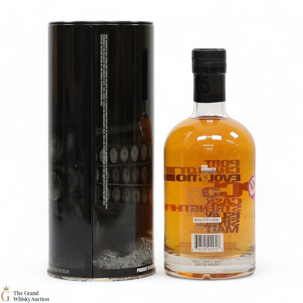 Port Charlotte PC5, produced by Bruichladdich Distillery, is a heavily peated spirit. It was the first release of heavily peated Port Charlotte and was produced in 2001 from some of the first spirits to be produced after the distillery's reopening. The single malt was bottled at 5 years old in 2006 and was limited to 6038 bottles.
