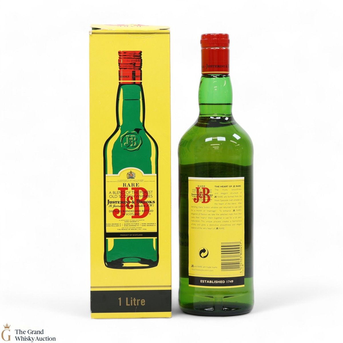 This 1-litre bottle of Justerini and Brooks blended whisky. J&B Rare is so recognisable as they haven't changed the iconic bottle or label design much for decades!