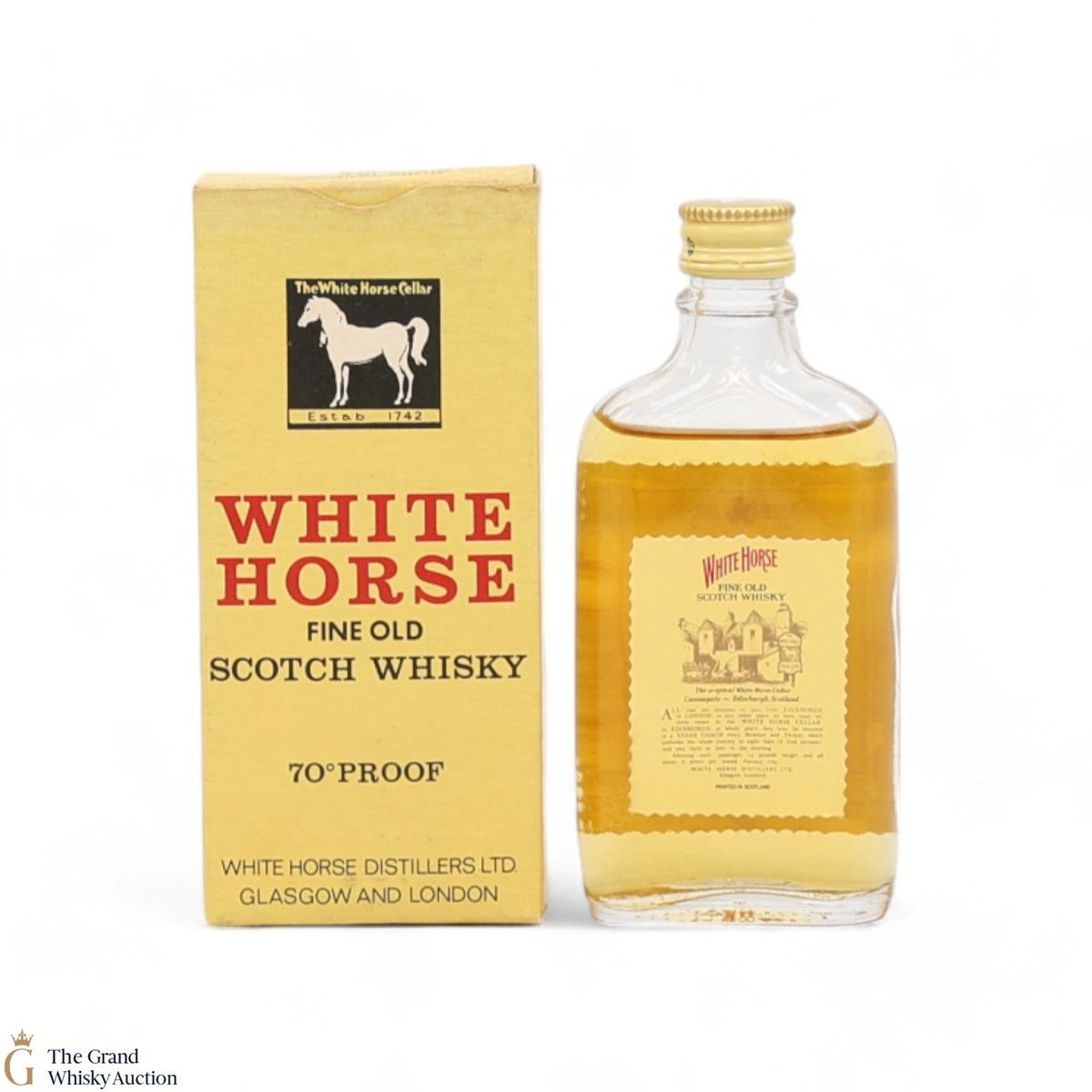 This is a miniature bottle of the White Horse Fine Old Scotch Whisky from Scotland bottled at 70 Proof. The size is not stated on the bottle.