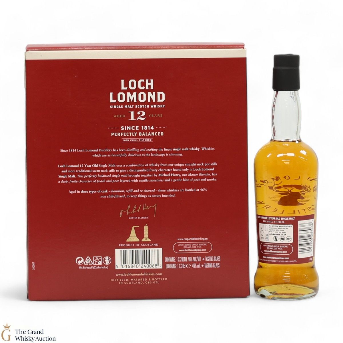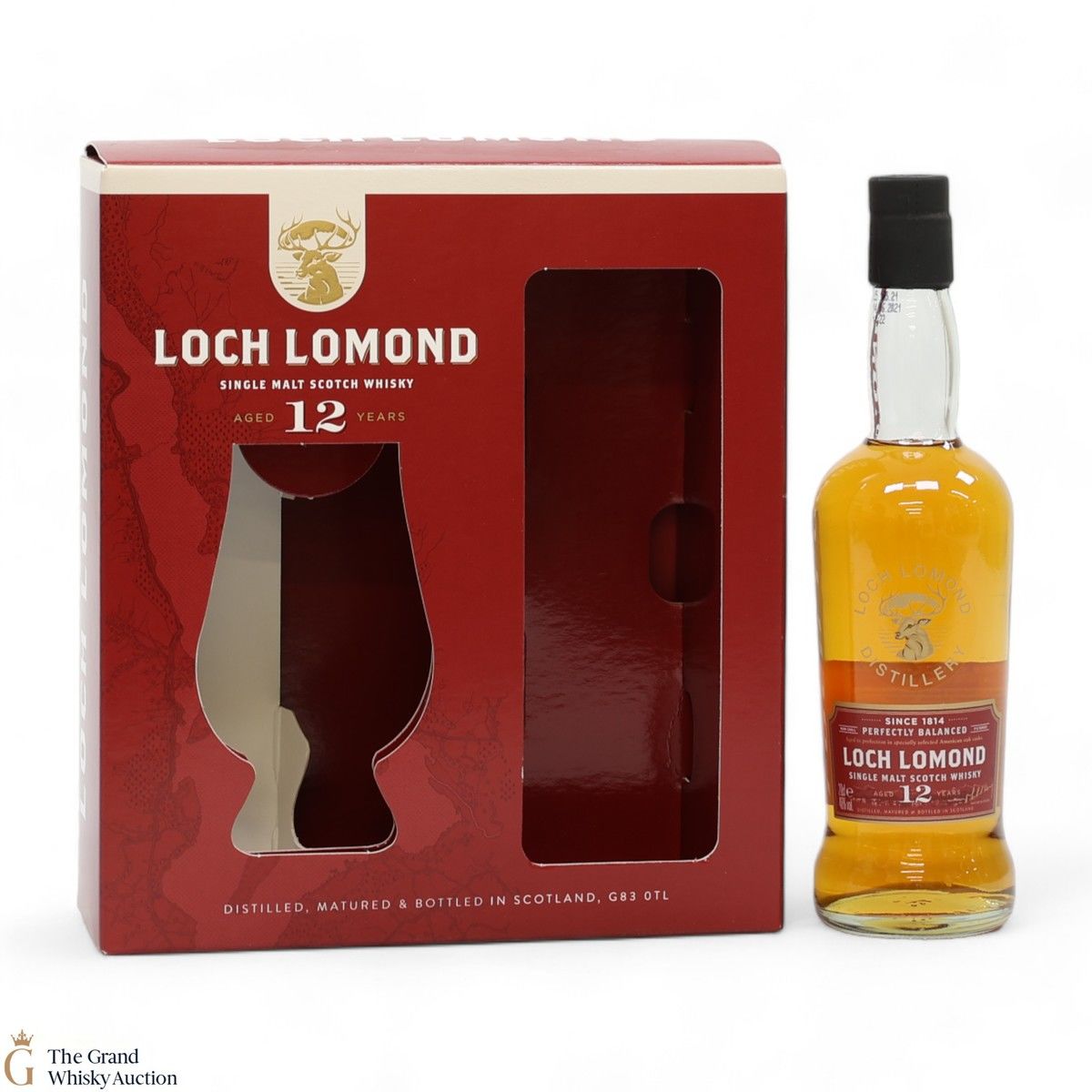 A single malt Loch Lomond Distillery aged for 12 years. This expression was matured in American Oak and drawn from a selection of three cask types - bourbon casks, refill casks and recharged casks. This lot contains a Loch Lomond Whiskies branded whisky glass.