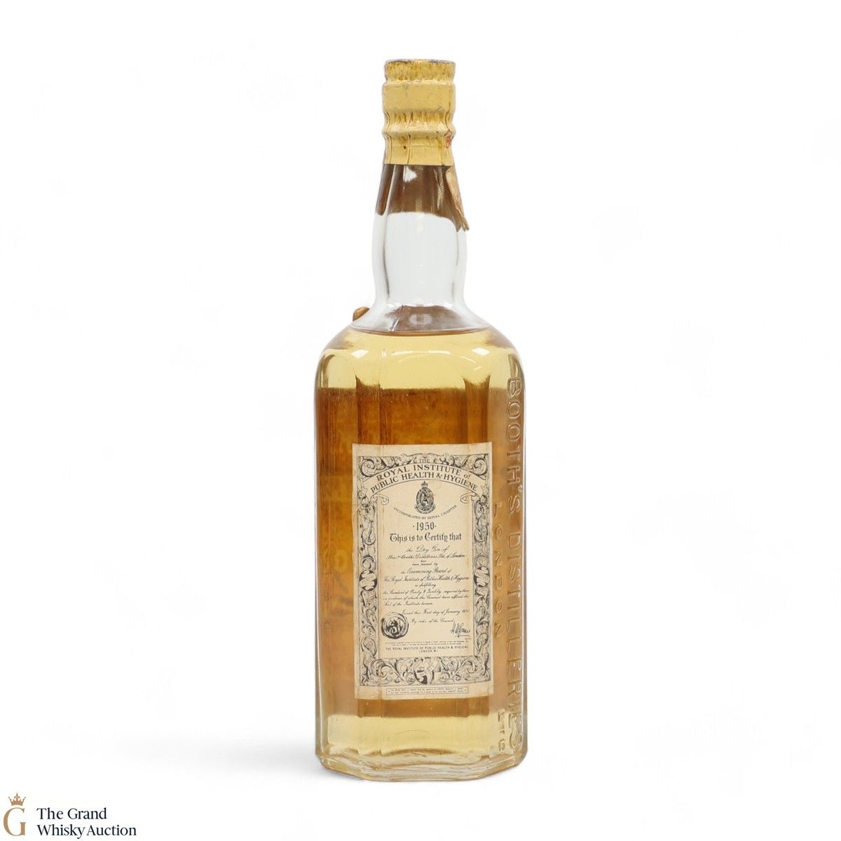 Booth's Gin has a rich history that dates back to the 1740s. The famous red lion trademark is present as well as a 1950s Royal Institue of Public Health & Hygiene label on the back of the bottle.