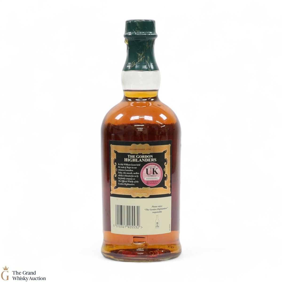 Due to the various ages of bottles and their seals, the condition of liquid is at the buyer's discretion and no claim can be lodged against failure/leakage in transit. Loss and breakage cover is available at 3% of the hammer price as standard. If the lot is not insured, no claim can be lodged against the courier or The Grand Whisky Auction for breakage or loss in transit.
