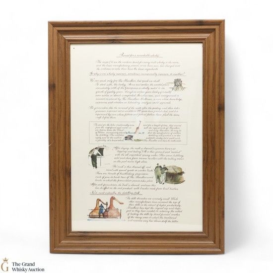 This framed print tells part of the story of The Macallan in copperplate writing and watercolour illustrations. These prints are reproductions of Sara Midda's work in 1975.
