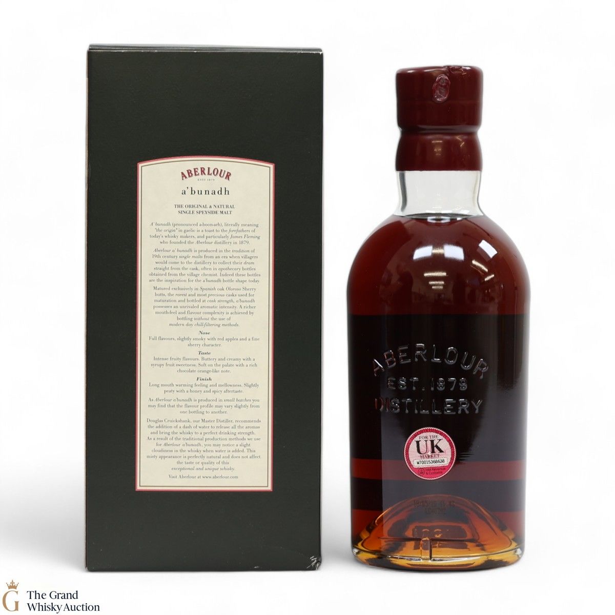 Meaning 'of the origin' in Gaelic, A'bunadh is made in homage to Aberlour's founder, James Fleming. This is batch No. 31 of the popular A'Bunadh single malt. It has been matured in Spanish Oloroso sherry butts and bottled at cask strength at 60.5% creating a dark luxurious whisky.