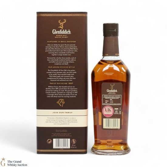 Matured in small batches the Glenfiddich 18 is arguably the most complex in the core range. The single malt has been matured in oloroso sherry and bourbon casks. It is very fragrant with tropical fruit and sherry cask influences, rich baked apple and cinnamon spice compliments by robust oak notes.