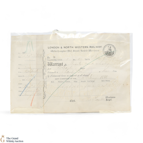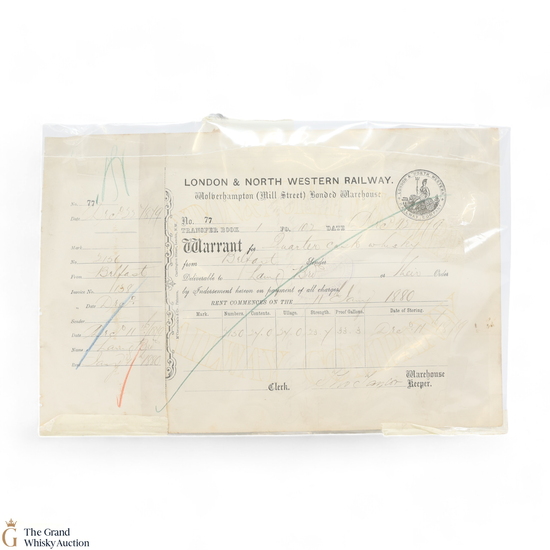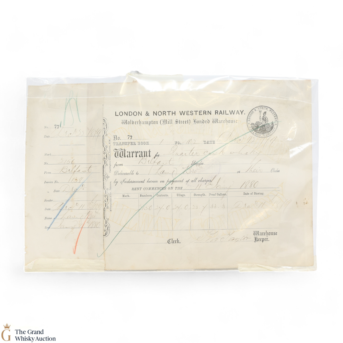 This lot contains an 1879 warrant for the transfer of a Quarter Cask from Belfast.