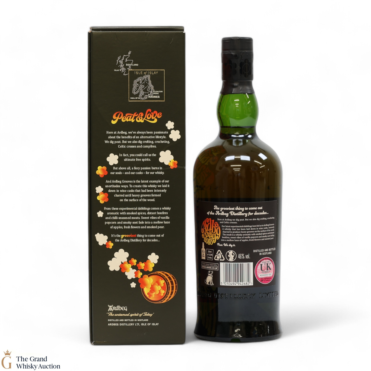 This limited edition Islay single malt was released to mark the 2018 Ardbeg Day at the Islay Festival of Music & Malt. The theme is a throwback to the Island's 1960s spirit, embodying the ideals of 'peat & love'! Ardbeg Grooves is crafted with ex-wine casks that are re-charred to create heavy grooves in the wood, allowing more interaction with the spirit and creating a richer flavour.