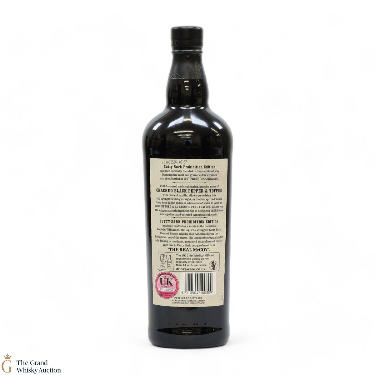 This small batch Prohibition edition of Cutty Sark has been crafted as a salute to the notorious Captain William S. McCoy, who smuggled Cutty Shark blended Scotch whisky into America during the Prohibition era of the 1920s. Bottled at 50% and housed in a black glass bottle with a cork seal, which was typical of bottles during the era.