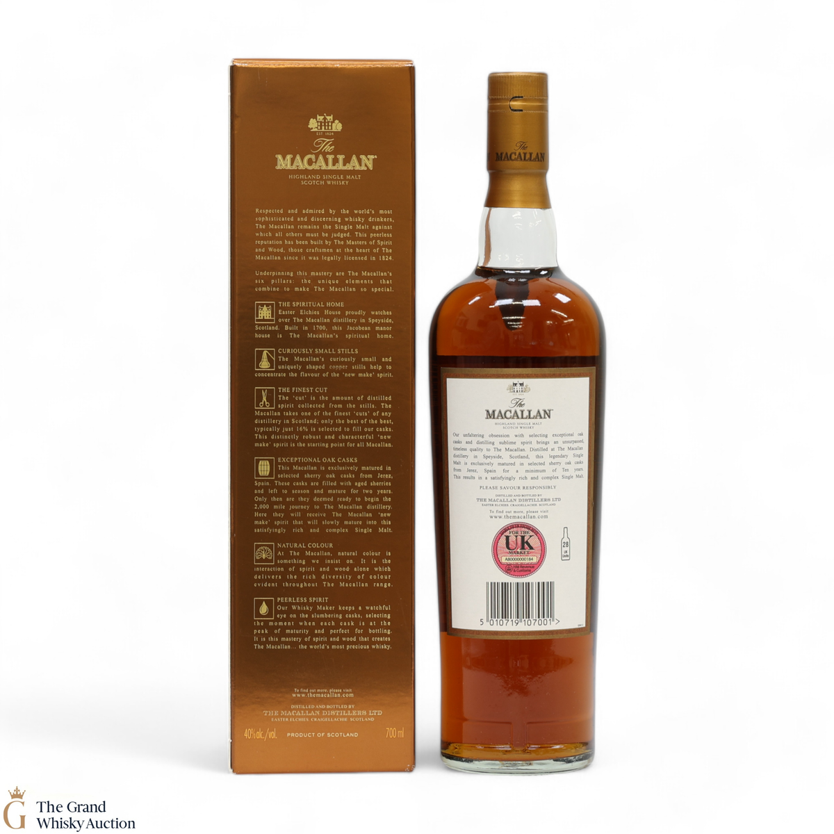 Distilled at the world-renowned Macallan Distillery in Speyside, this single malt was matured exclusively in sherry oak casks from Jerez, Spain. It was aged for a total of 10 years prior to bottling at a strength of 40% ABV.