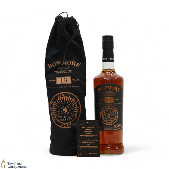 This is the Feis Ile 2023 release from Bowmore Distillery. Matured in a first-fill Oloroso Sherry and PX casks for 18 years, this single malt was bottled at 52.8% ABV. This rare annual release from Bowmore is limited to just 3500 bottles.