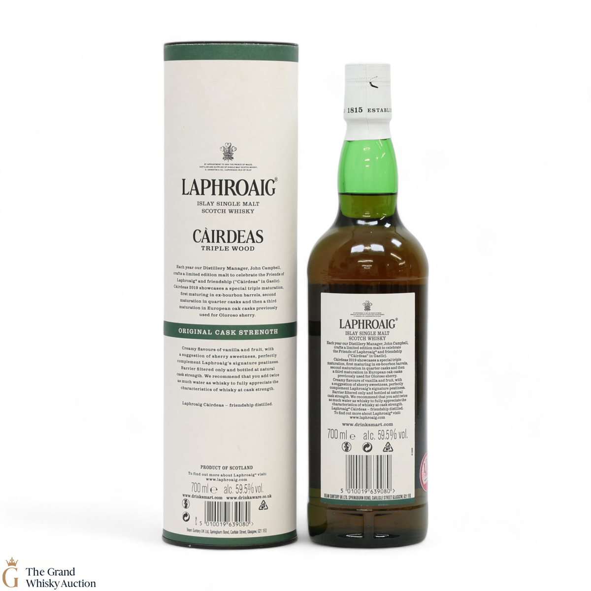 Cairdeas, Gaelic for 'friendship', is an annual bottle release by Laphroaig for their Friends of Laphroaig members. This Càirdeas Triple Wood Cask Strength was released for Fèis Ìle 2019. It has had a special triple maturation; first matured in ex-bourbon barrels, then in quarter casks, and finally in European oak casks which previously held oloroso sherry. Before being bottled at a cask strength of 59.5% ABV.