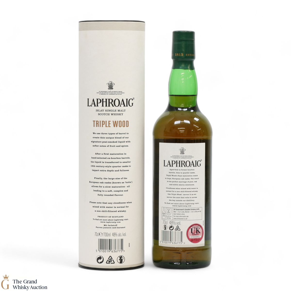 This is a 70 cl bottling of Laphroaig Triple wood. It was originally launched for the duty-free market but the Triple Wood has become a core expression from Laphroaig. The single malt has been triple matured; in bourbon barrels, quarter casks and then Oloroso sherry butts.
