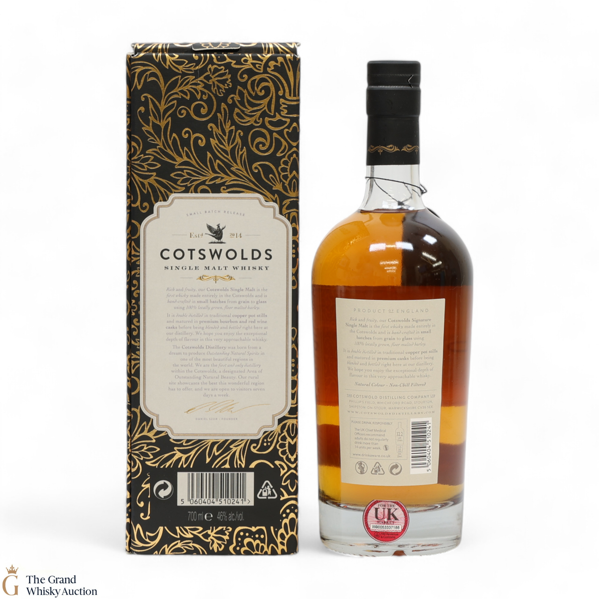 Cotswolds Signature is made from 100% locally grown, floor-malted barley and aged in first-fill bourbon and red wine casks.