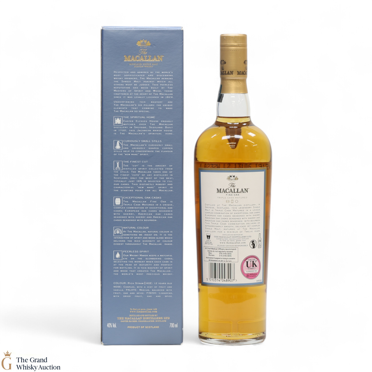 This 12-year-old single malt is part of Macallan's Fine Oak, triple cask matured range. It has been matured for twelve years in three oak cask types; Europen oak seasoned with sherry, American oak seasoned with sherry and American oak seasoned with bourbon. The Macallan Fine Oak 12-Year-Old is medium-bodied and balanced with fruit, oak and spice.