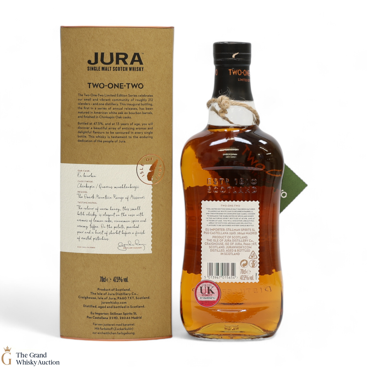 The Two-One-Two Limited Edition Series celebrates the small and vibrant community of roughly 212 Jura islanders – and one distillery. This inaugural bottling, the first in a series of annual releases, has been matured in American White Oak ex-bourbon barrels and finished in Chinkapin Oak casks. Bottled at 47.5%, and at 13 years of age