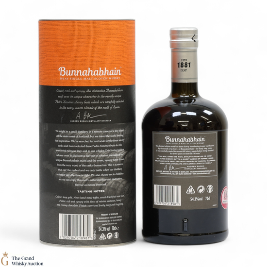 A limited-edition bottling from the Bunnahabhain distillery on the northeast coast of Islay. Distilled in 2003 and was initially aged in second-fill Sherry casks until 2011. At this point, the whisky was transferred over to yet more Sherry casks - first-fill Pedro Ximénez casks! It was bottled in 2017 at cask strength. This is one of 6768 individually numbered bottles.