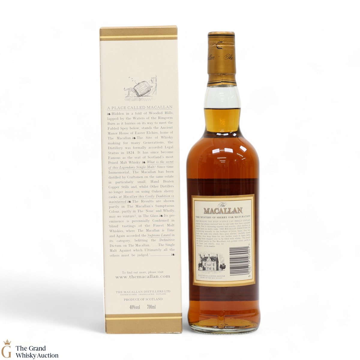 An old bottling of Macallan 10-year-old, which has been exclusively matured in sherry oak casks. Bottled in the early 2000s.