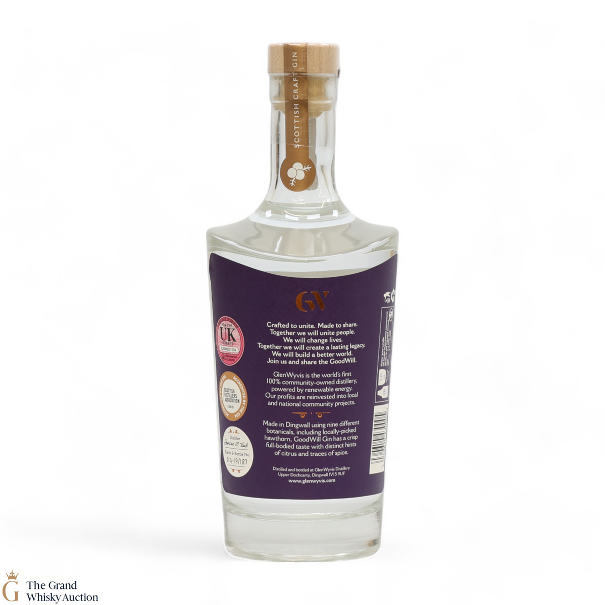GlenWyvis Goodwill Scottish Gin was produced in the Highlands of Scotland. It features a blend of classic gin botanicals like juniper with unique elements that may include locally foraged herbs or fruits.
