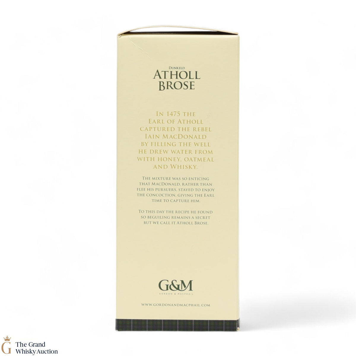 Dunkeld Atholl Brose is a unique Scotch whisky liqueur produced by Gordon & MacPhail. This liqueur is inspired by a traditional Scottish recipe that dates back to the 15th century. Atholl Brose is made from a blend of single malt Scotch whisky, honey, and oatmeal.