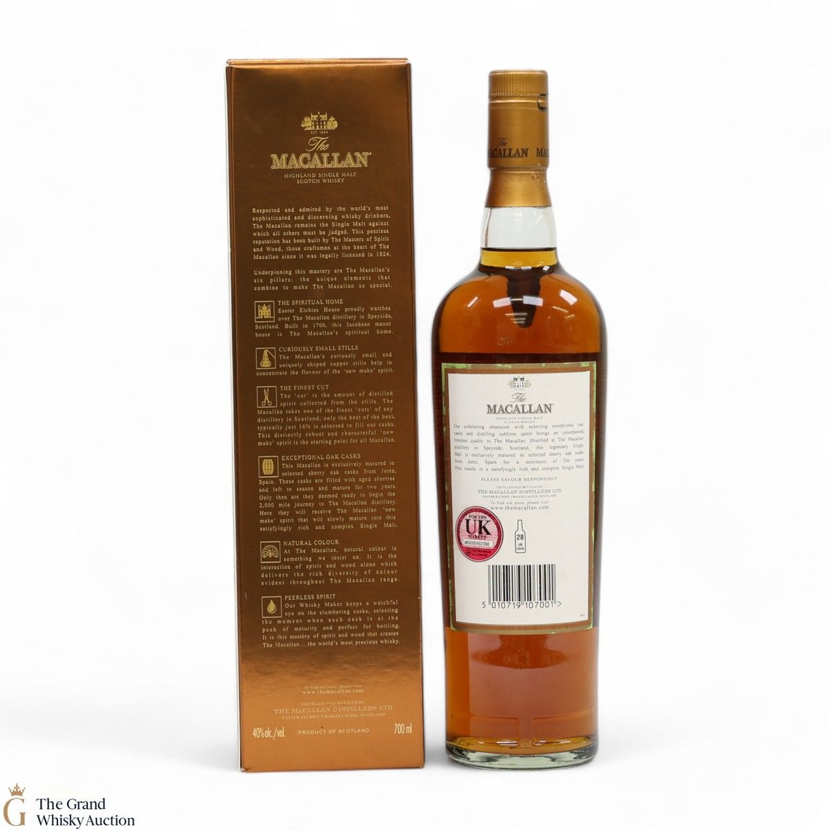 Distilled at the world-renowned Macallan Distillery in Speyside, this single malt was matured exclusively in sherry oak casks from Jerez, Spain. It was aged for a total of 10 years prior to bottling at a strength of 40% ABV.