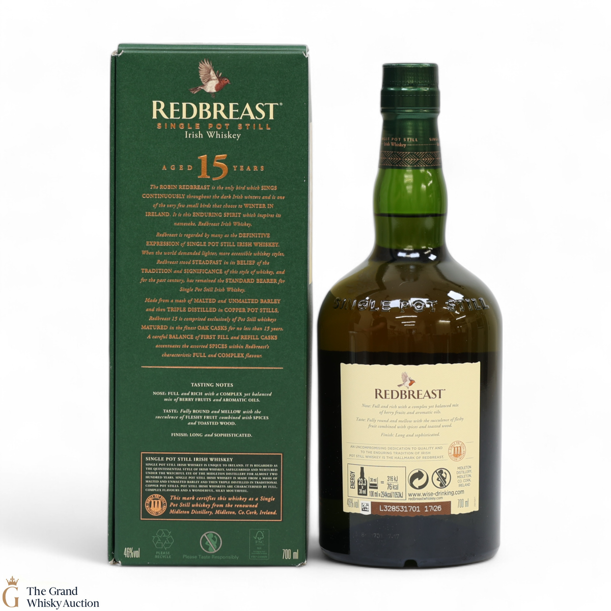 Redbreast is a single pot still whiskey distilled at New Midleton in Ireland using a combination of malted and un-malted barley. Triple distilled in copper pot stills. Redbreast 15 Year Old has won awards including a Gold Medal at the International Spirits Challenge 2010.