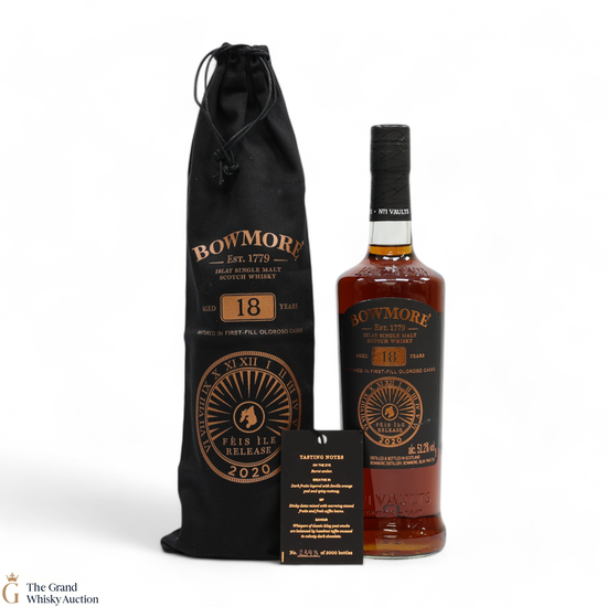 This is the Feis Ile 2020 release from Bowmore Distillery. Matured in a first-fill Oloroso Sherry cask for 18 years, this single malt was bottled at 51.2% ABV. This rare annual release from Bowmore is limited to just 3000 bottles.