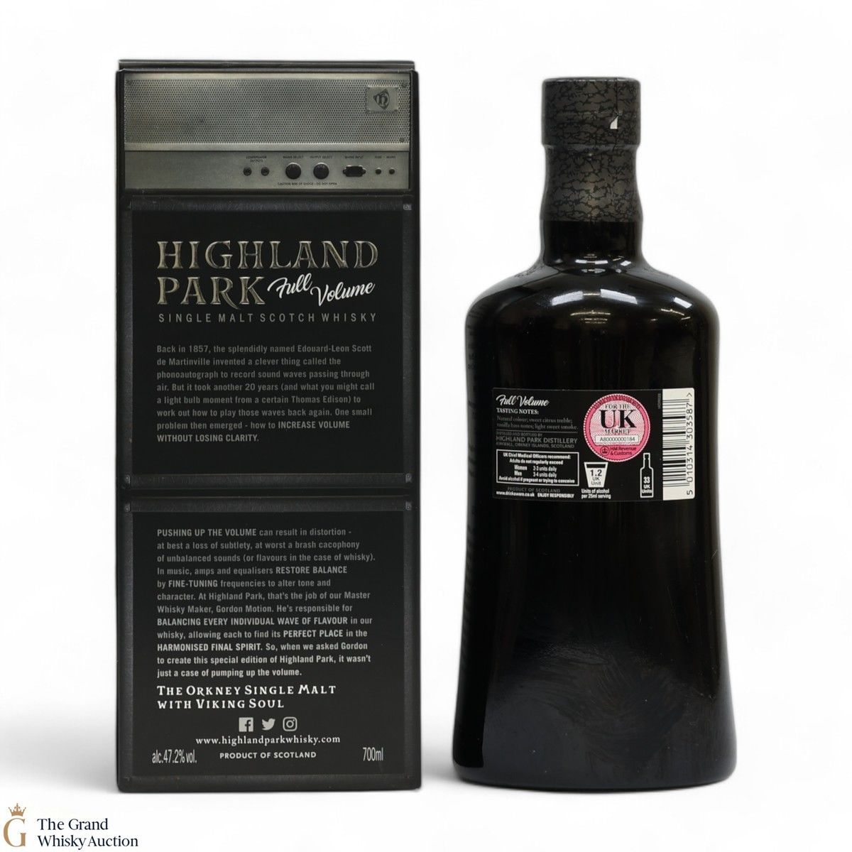 Full Volume by Highland Park was distilled in 1999 and bottled in 2017 from 481 casks. The single malt was matured exclusively in first-fill bourbon casks and was bottled at 47.2% ABV and comes presented in a themed presentation box resembling a speaker.