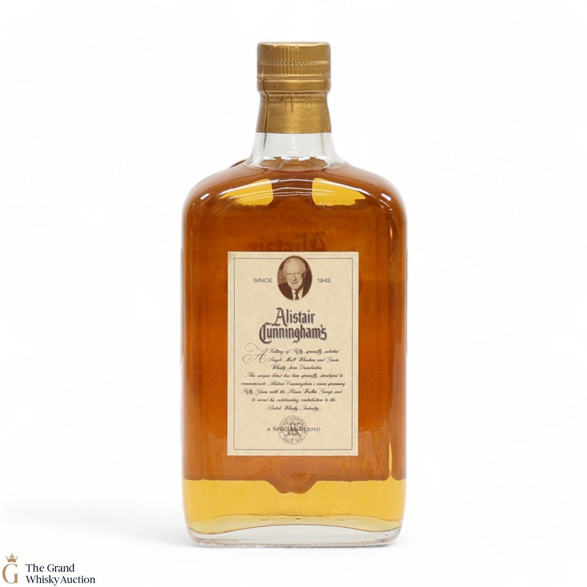 Blended and bottled by Allied Distillers based in Dumbarton, this 50 year old blended whisky was a vatting of fifty specially selected single malt and grain whisky. Dedicated to Alistair Cunningham's 50 year long career.