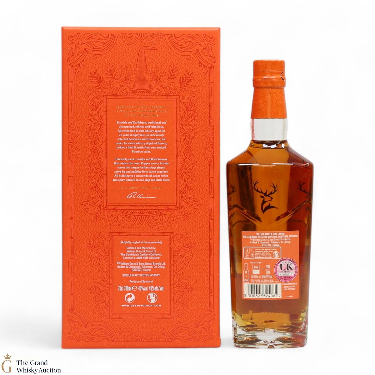The Glenfiddich Gran Reserva has matured and mellowed in American Oak Casks for 21 years before being finished in previously used Caribbean Rum casks for 4 months.