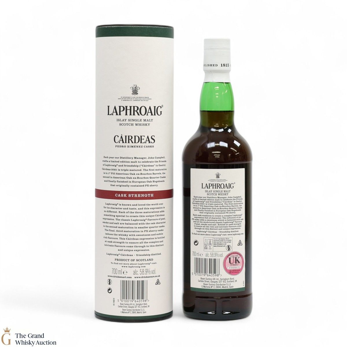 The 2021 edition of Laphroaigs Cairdeas series was first matured in a 1st fill American oak ex-bourbon barrel, then in an American oak ex-bourbon quarter cask before finally being finished in European PX sherry casks. Bottled at the cask strength of 58.9% ABV in 2021 to celebrate the Friends of Laphroaig.