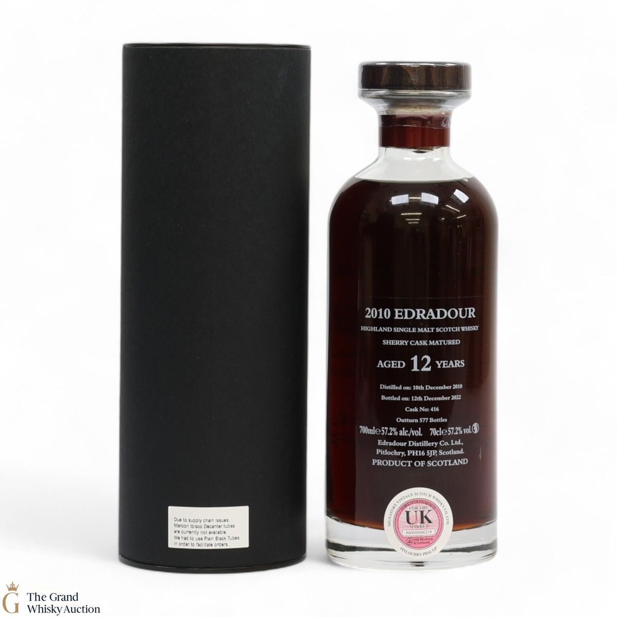 Due to the various ages of bottles and their seals, the condition of liquid is at the buyer's discretion and no claim can be lodged against failure/leakage in transit. Loss and breakage cover is available at 3% of the hammer price as standard. If the lot is not insured, no claim can be lodged against the courier or The Grand Whisky Auction for breakage or loss in transit.