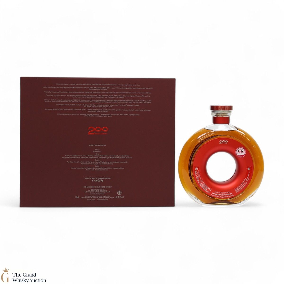This whisky is contained in a unique circular vessel symbolising the circle of life and the ongoing journey from the past to the future. It was matured in one of Macallan's bespoke sherry-seasoned European oak casks until bottled at a strength of 43.6% ABV.