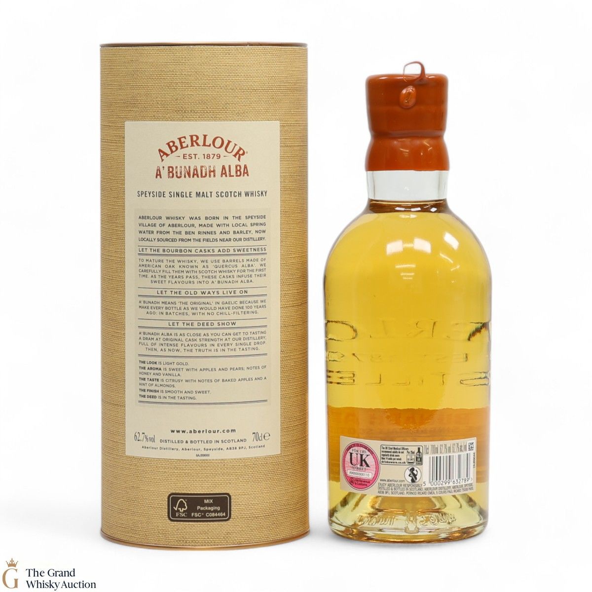 Distilled at the Aberlour Distillery, this single malt was matured in bourbon oak barrels until being bottled at the cask strength of 62.7% ABV. This is batch 5 of the A'Bunadh Alba.