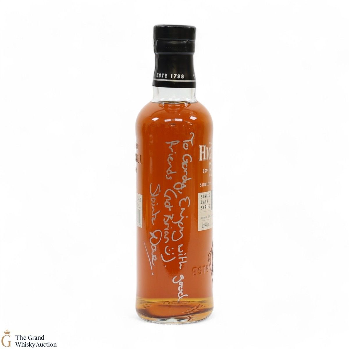 Due to the various ages of bottles and their seals, the condition of liquid is at the buyer's discretion and no claim can be lodged against failure/leakage in transit. Loss and breakage cover is available at 3% of the hammer price as standard. If the lot is not insured, no claim can be lodged against the courier or The Grand Whisky Auction for breakage or loss in transit.