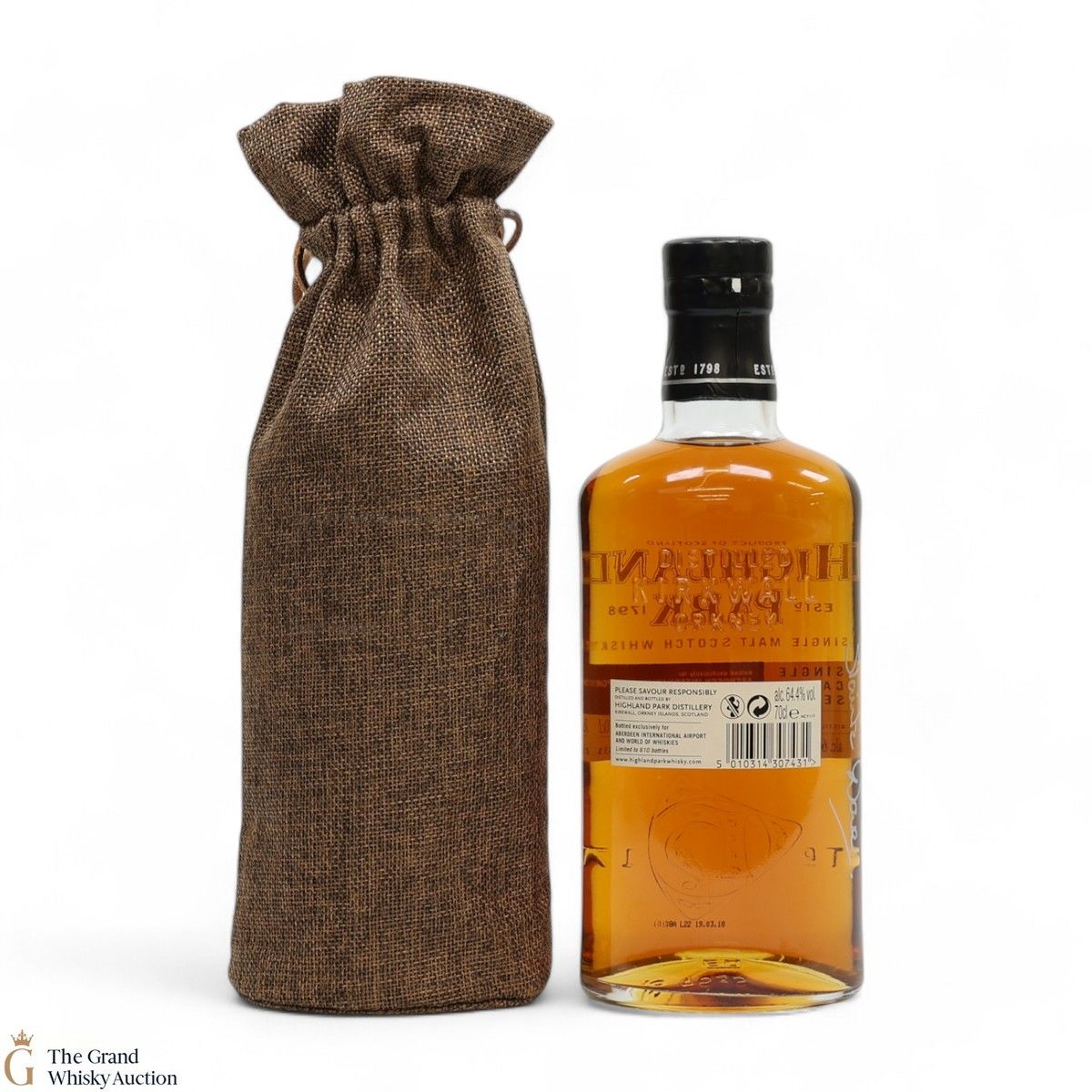 This Highland Park Single Cask Edition was bottled in 2018 exclusively for Aberdeen International Airport and World of Whiskies. With just 610 bottles available, the 12-year-old single malt whisky is drawn from an intriguing mix of American/Spanish oak casks and bottled at a cask strength of 64.4% ABV.