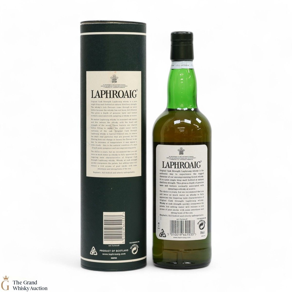 A 70cl cask strength bottle of the medicinal 10-year-old from Islay's bestselling distillery, Laphroaig. In making Laphroaig, malted barley is dried over a peat fire. The smoke from this peat, found only on Islay, gives Laphroaig its particularly rich flavour.