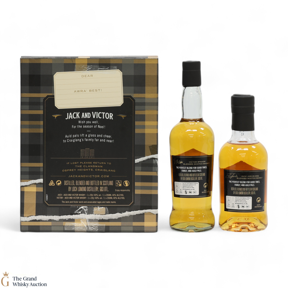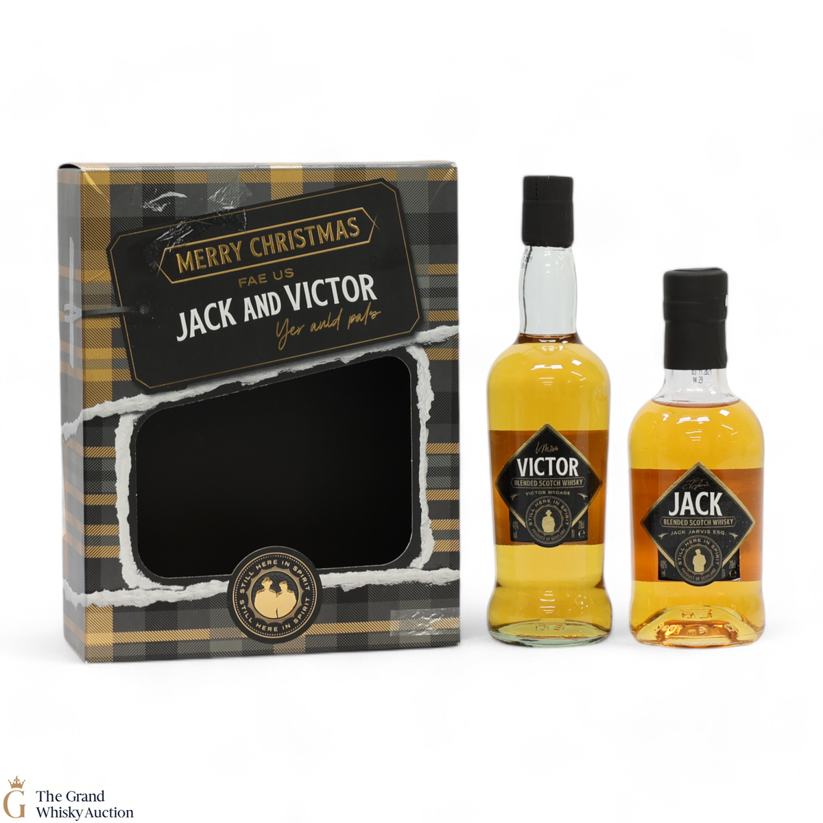 This limited release 'Still Here in Spirit' whisky represents the renowned Jack & Victor duo from the Scottish show 'Still Game'. A Christmas special, this lot contains one Jack Jarvis Esq. and one Victor McDade bottle along with a whisky glass.