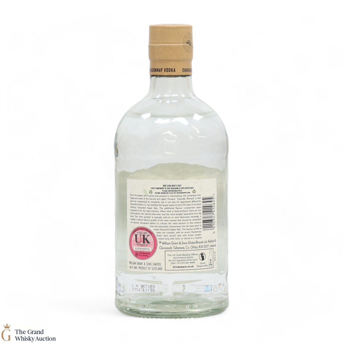 Discarded Grape Skin Chardonnay Vodka is a product by Discarded Spirits Co. This vodka is crafted from Chardonnay grape skins that are a by-product of winemaking. Instead of letting these skins go to waste, Discarded Spirits Co. repurposes them into a distinctive vodka.