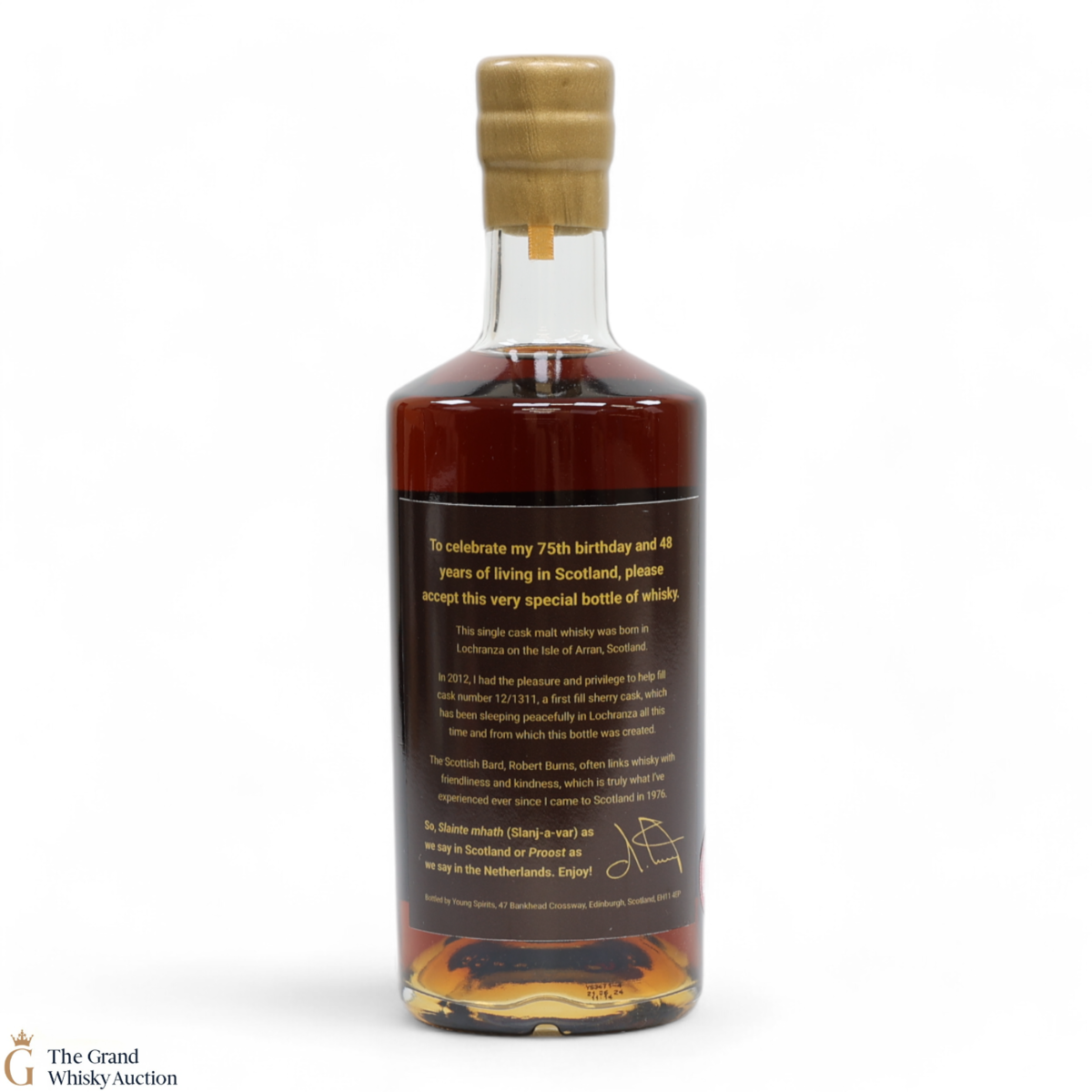 Due to the various ages of bottles and their seals, the condition of liquid is at the buyer's discretion and no claim can be lodged against failure/leakage in transit. Loss and breakage cover is available at 3% of the hammer price as standard. If the lot is not insured, no claim can be lodged against the courier or The Grand Whisky Auction for breakage or loss in transit.